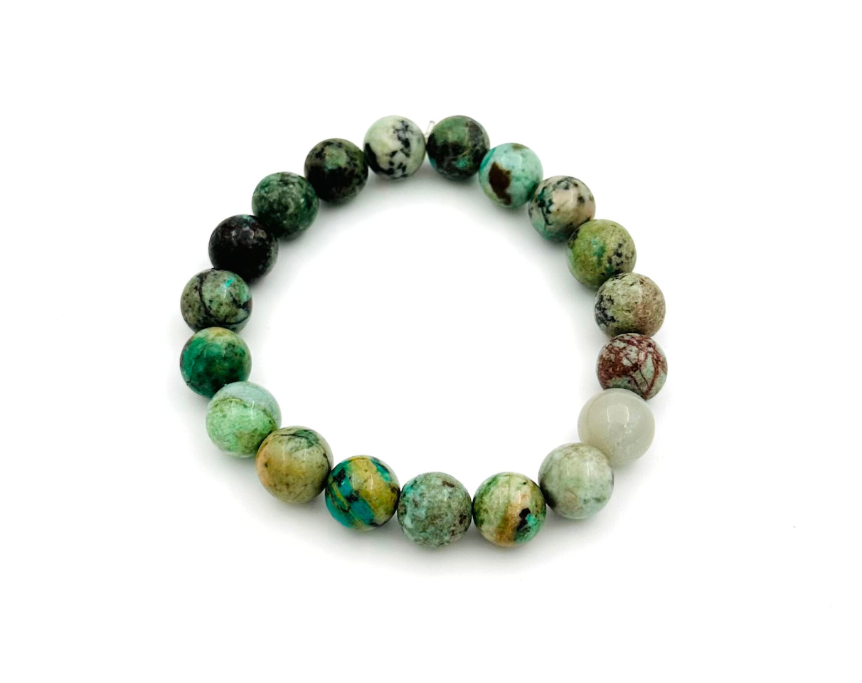 Afrikos turkio apyrankė – tai vidinės ramybės, augimo ir brandžios stiprybės papuošalas. Šis akmuo neveikia per staigius impulsus ar emocinius pakilimus – jis kviečia į lėtą, stabilų pokytį, leidžiantį keistis be spaudimo ir vidinės kovos. Afrikos turkis moko judėti pirmyn ne per skubėjimą, o per vidinį aiškumą.