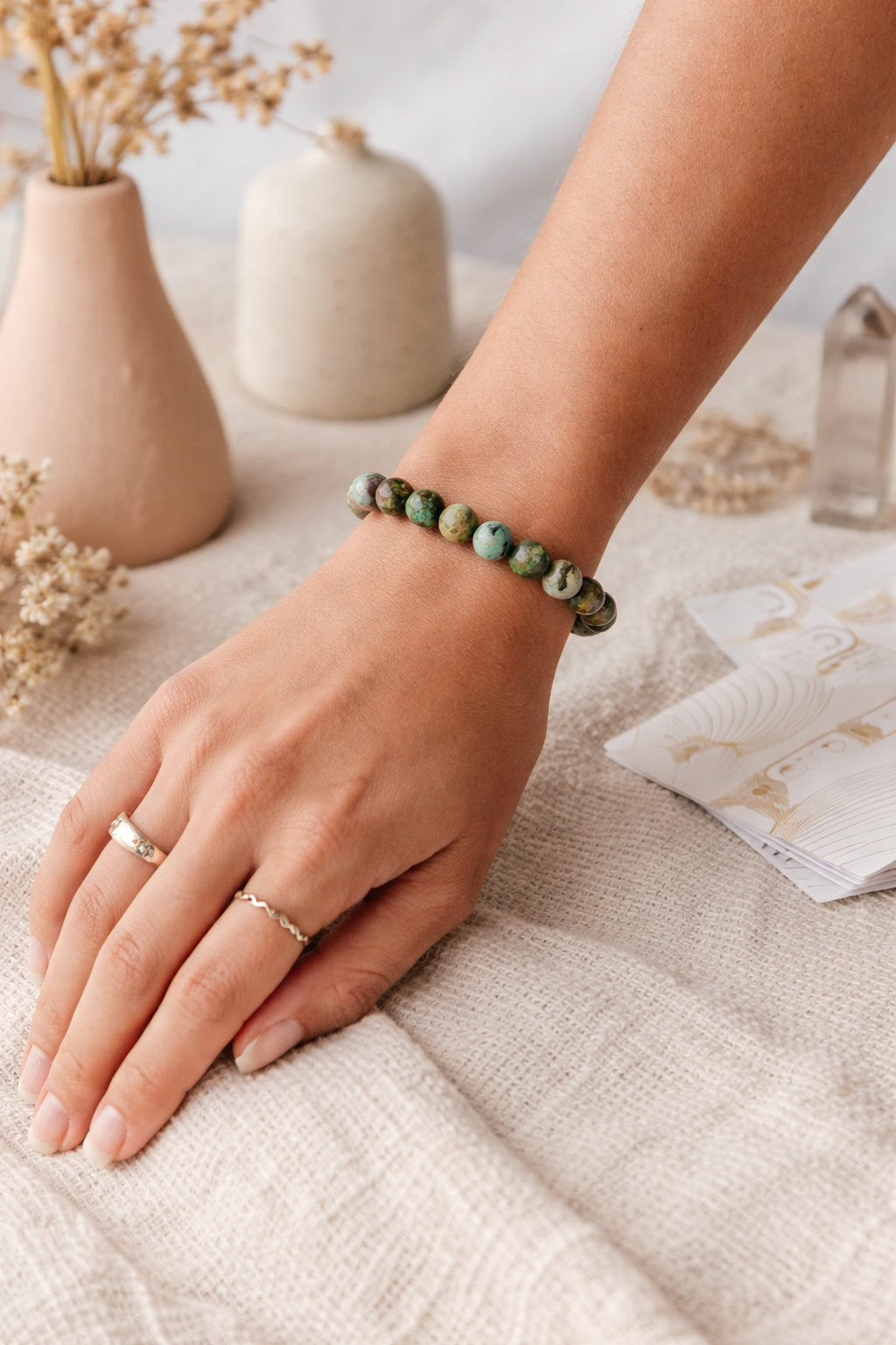 Afrikos turkis dažnai vadinamas sąmoningo augimo ir evoliucijos akmeniu. Jis palaiko tada, kai pokytis jau subrendęs viduje, bet norisi jį išgyventi ramiai ir tvirtai. Apyrankės forma leidžia šiai energijai būti arti kūno – veikti nuosekliai, tyliai ir stabiliai.