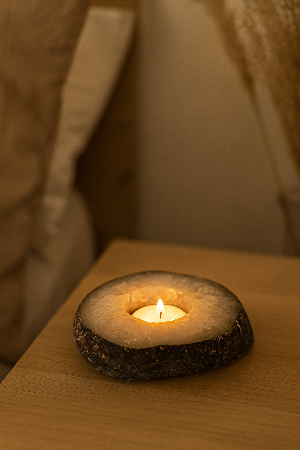 Žvakė simbolizuoja sąmoningą buvimą, o agatas – pastovumą. Kartu jie kuria vidinio aukuro jausmą: vietą, kurioje šviesa remiasi į tvirtą pagrindą, o ramybė tampa apčiuopiama.