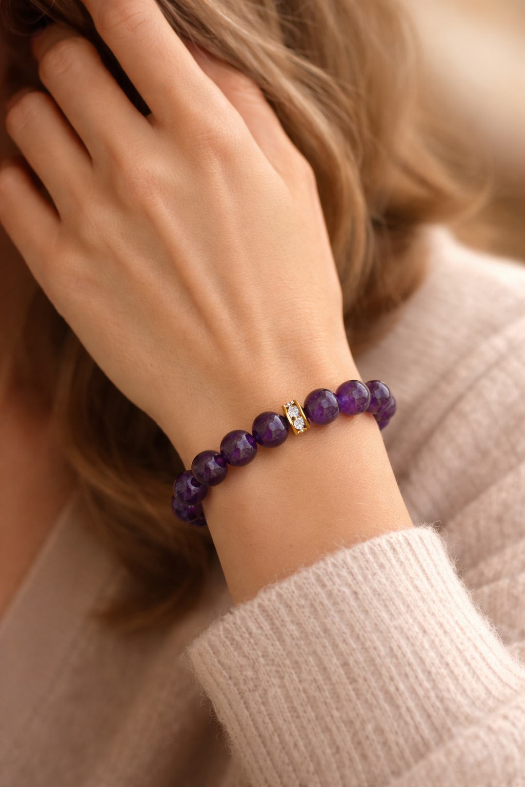 Nešiojama ant rankos, ametisto apyrankė veikia nuolat ir subtiliai – ji ne stumia pokyčius, o padeda juos suvokti, palaikydama aiškų, sąmoningą buvimą kasdienybėje.