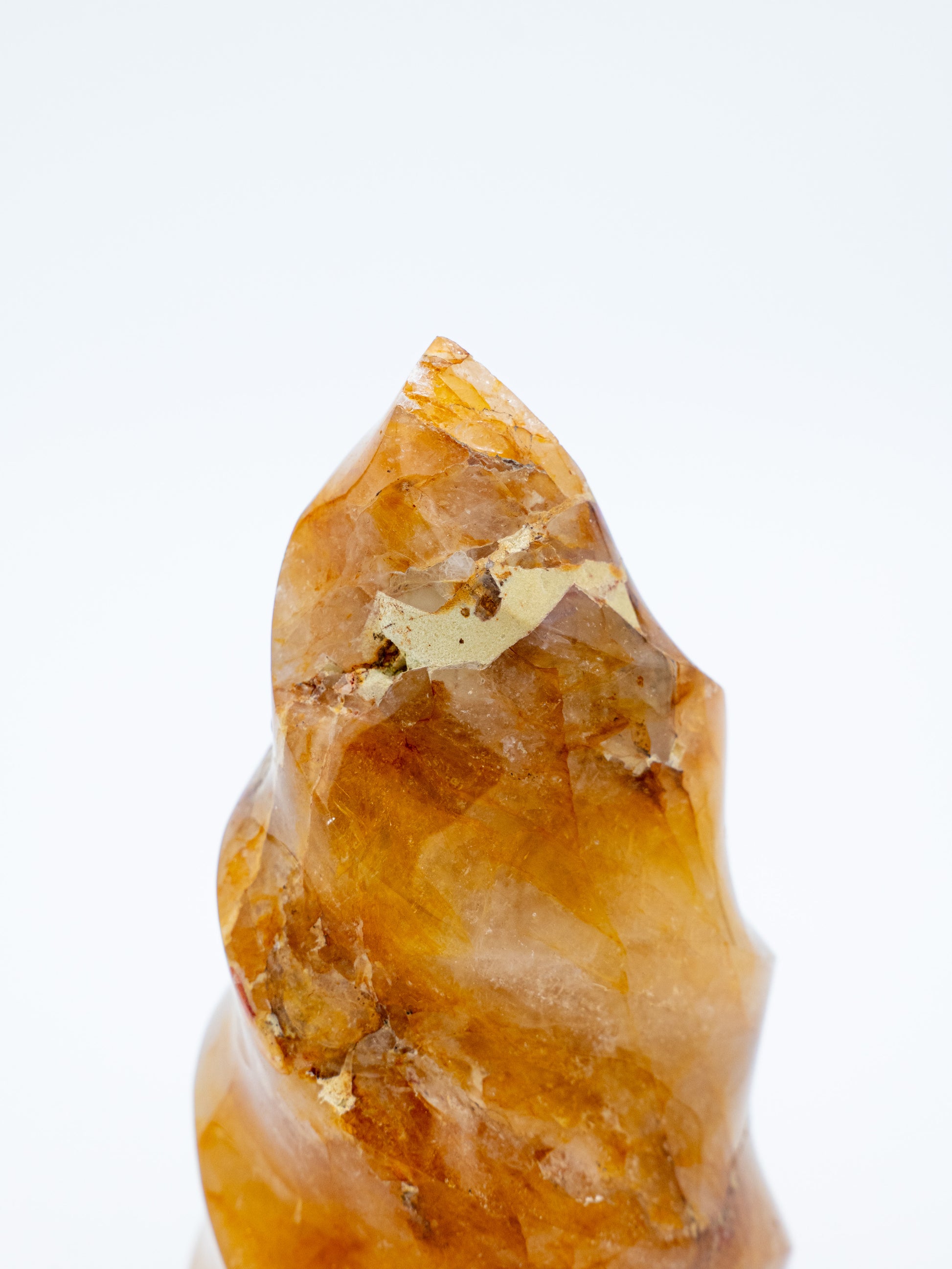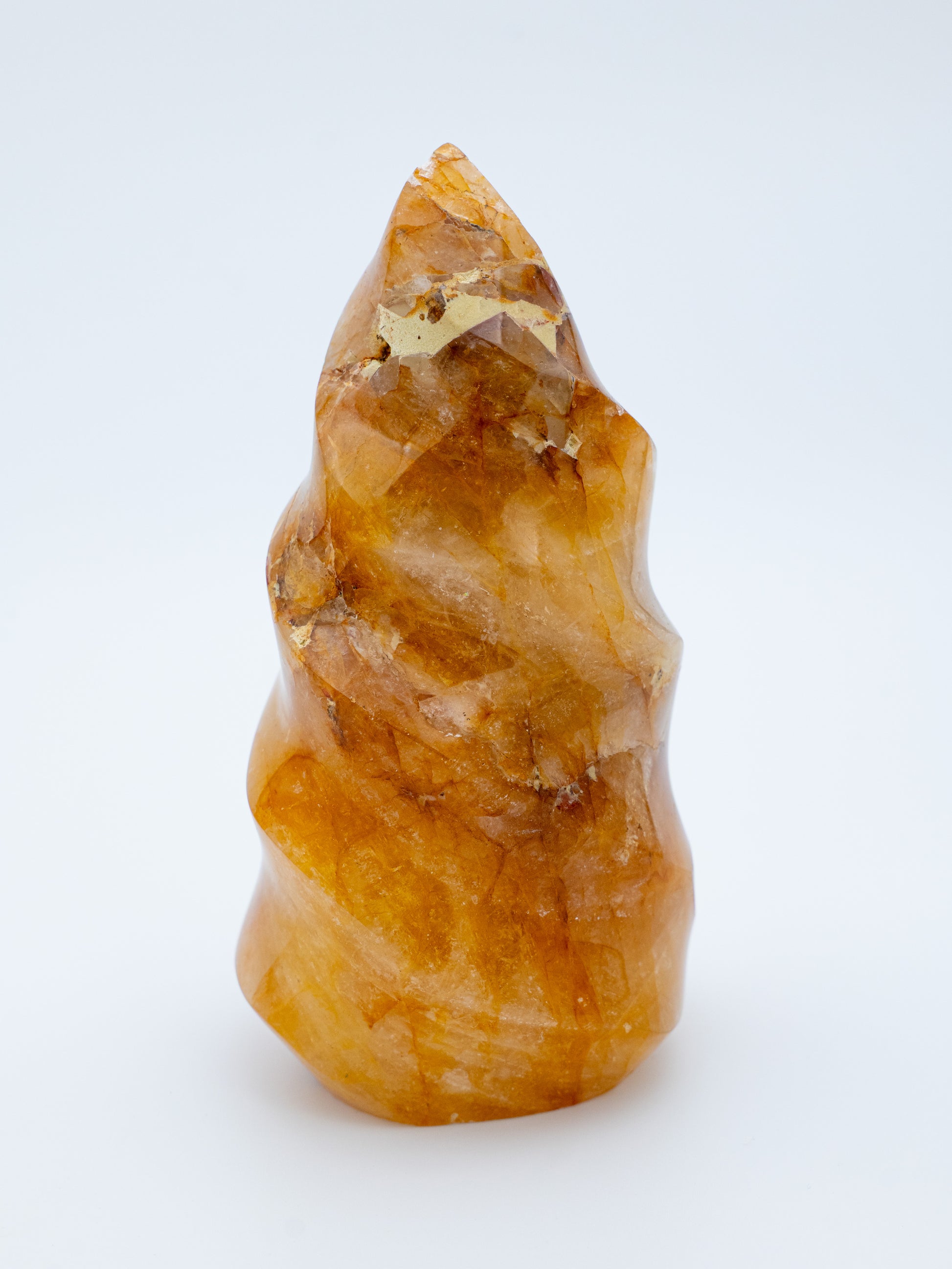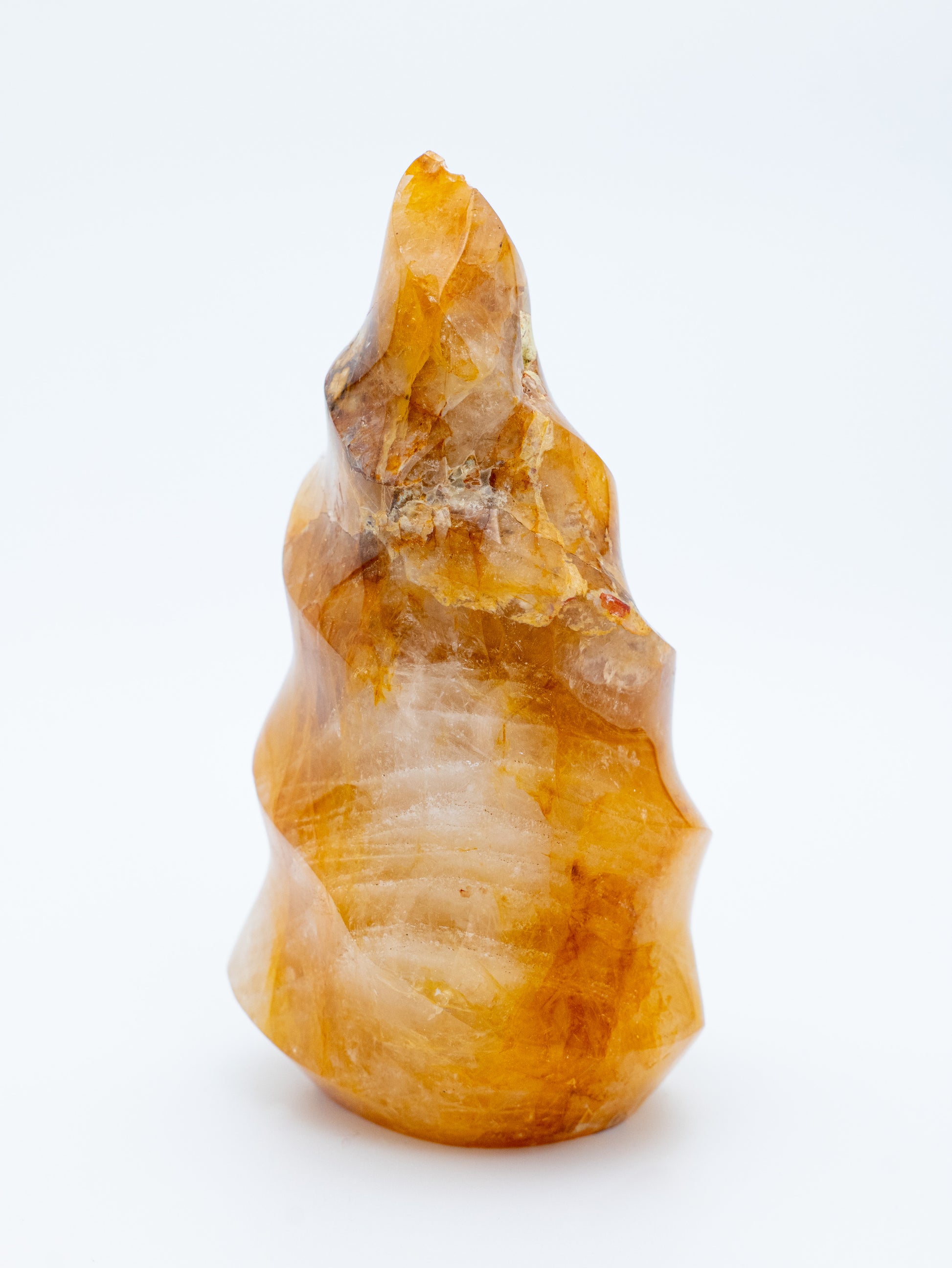 Auksinis kalcitas – tai sąmoningos transformacijos, vidinės brandos ir kryptingo veiksmo akmuo, nešantis šiltą, subrandintą energiją. Jo medaus–aukso atspalviai primena Saulės šviesą, kuri ne degina, o maitina, o liepsnelės forma simbolizuoja kryptingą augimą – ne staigų proveržį, bet tvirtą, nuoseklų judėjimą pirmyn.