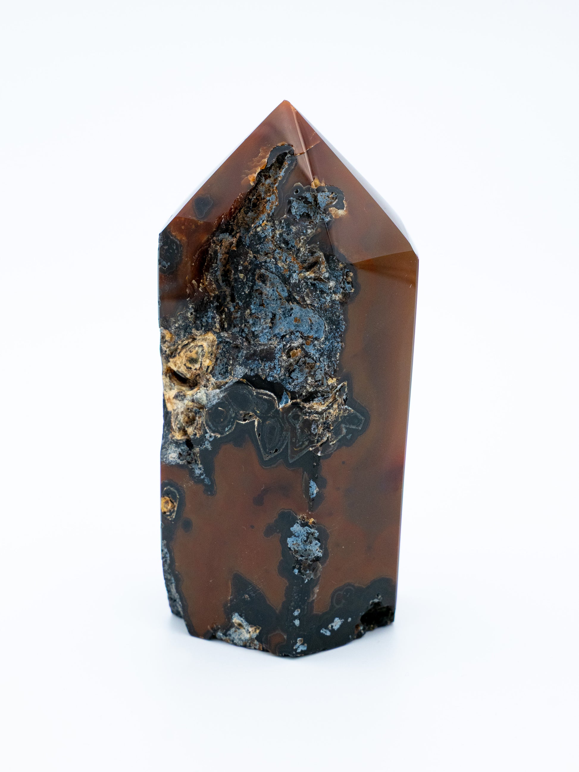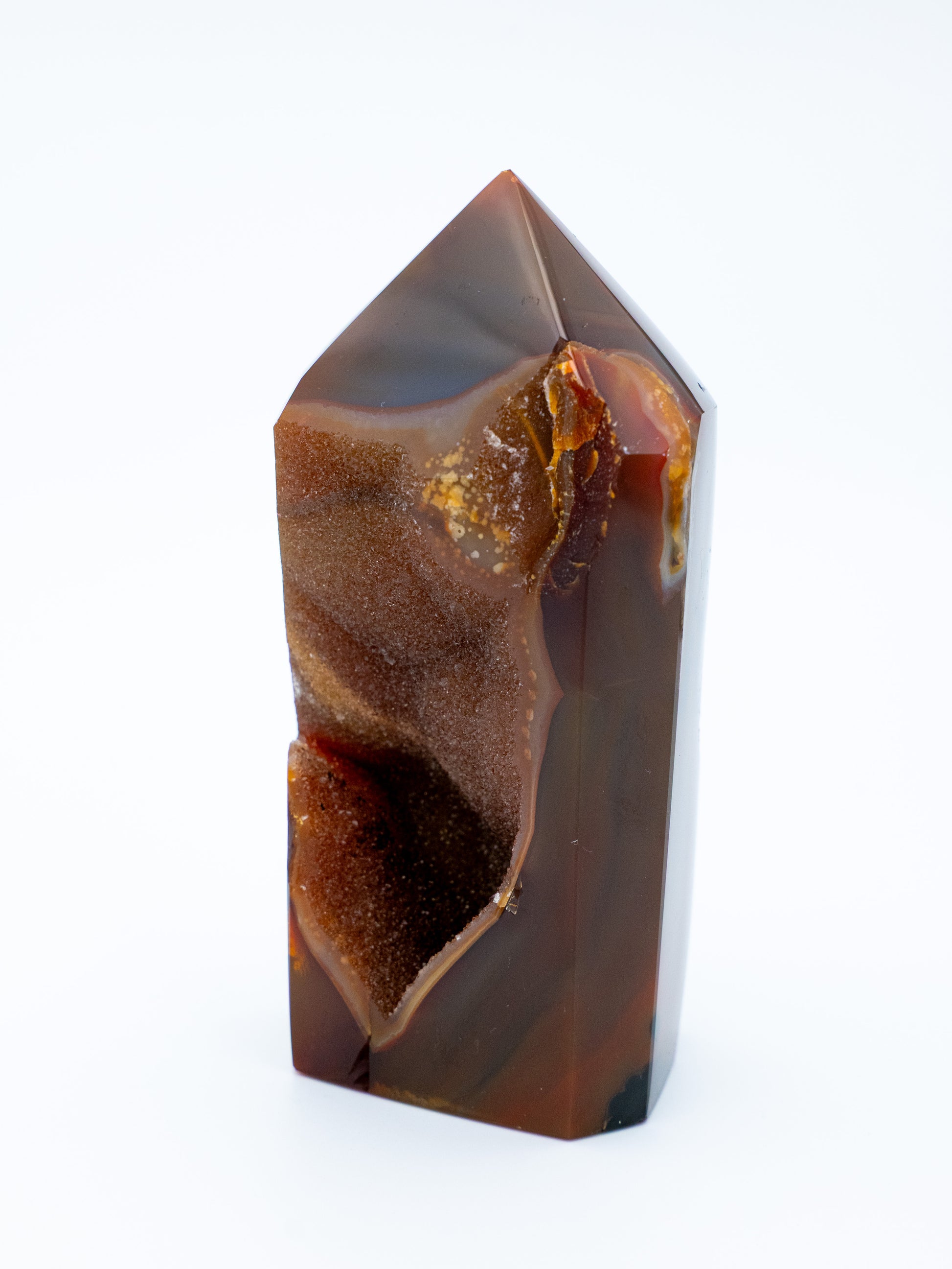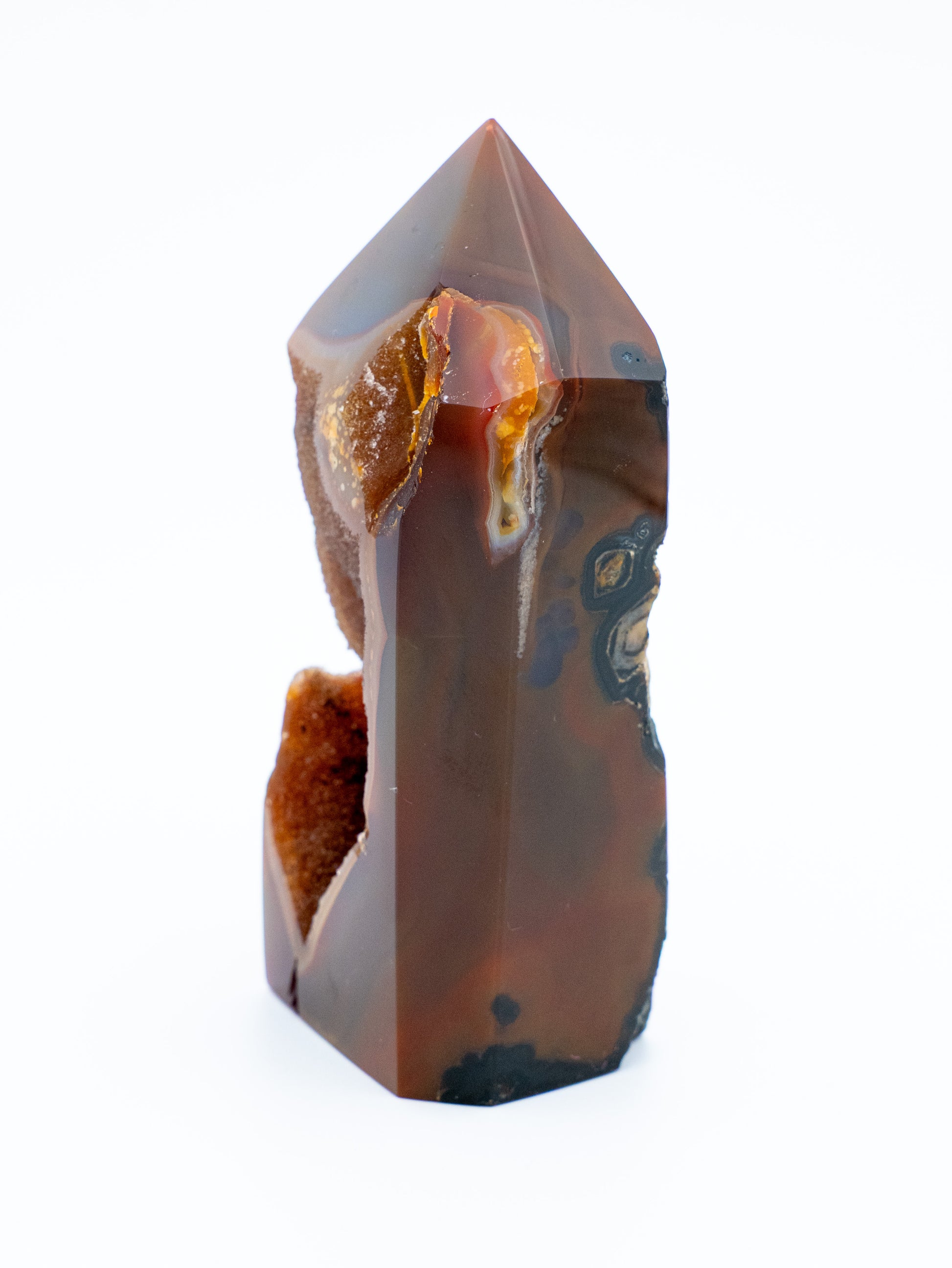 Braziliškas agatas su drūza – tai žemės išminties, vidinės ramybės ir natūralios apsaugos akmuo, savyje jungiantis agato stabilumą ir drūzos kristalinę šviesą. Bokšto forma suteikia kryptį ir ašį – tai akmuo, kuris įžemina, bet kartu kelia sąmonę, leidžia ramybei kilti iš tvirto vidinio pagrindo.