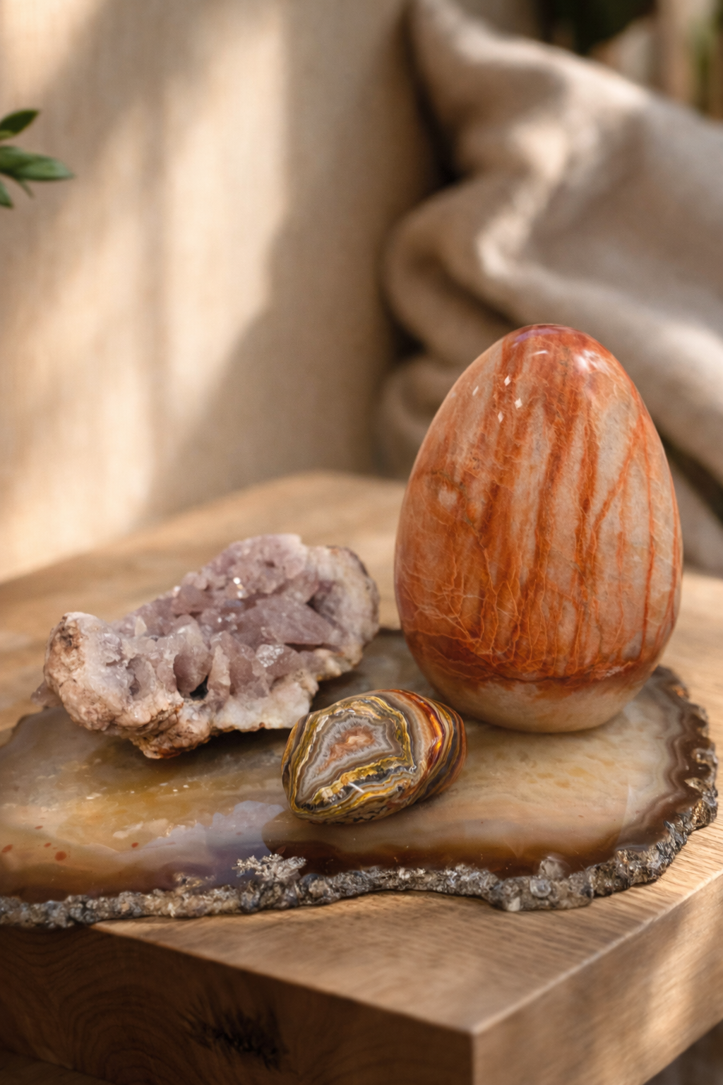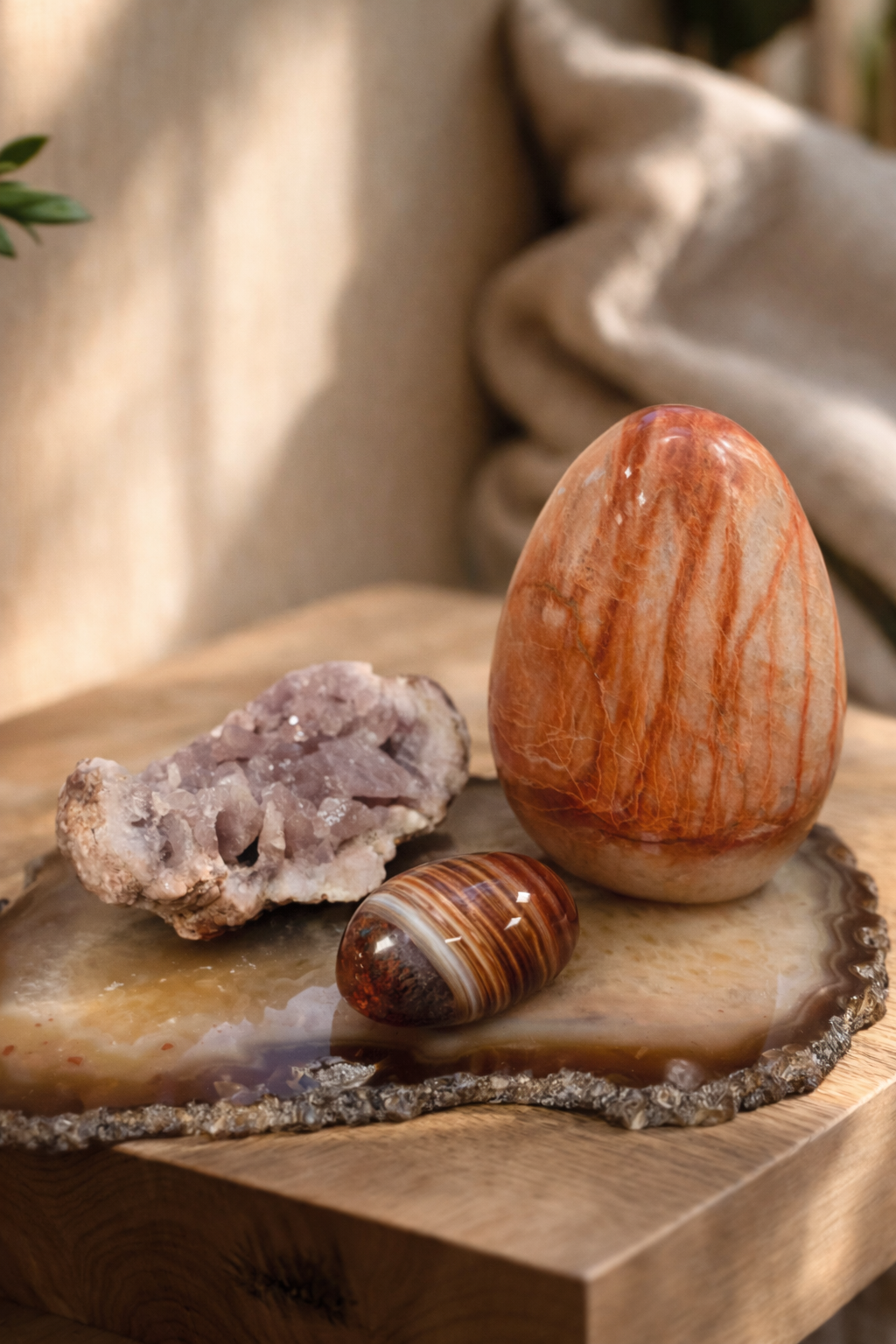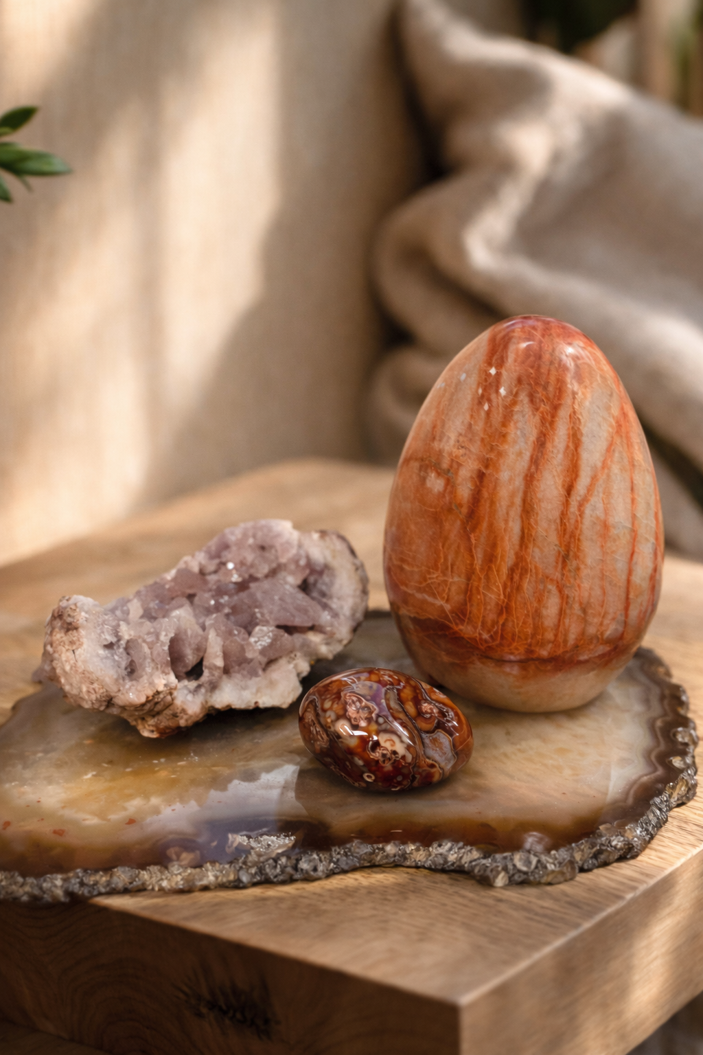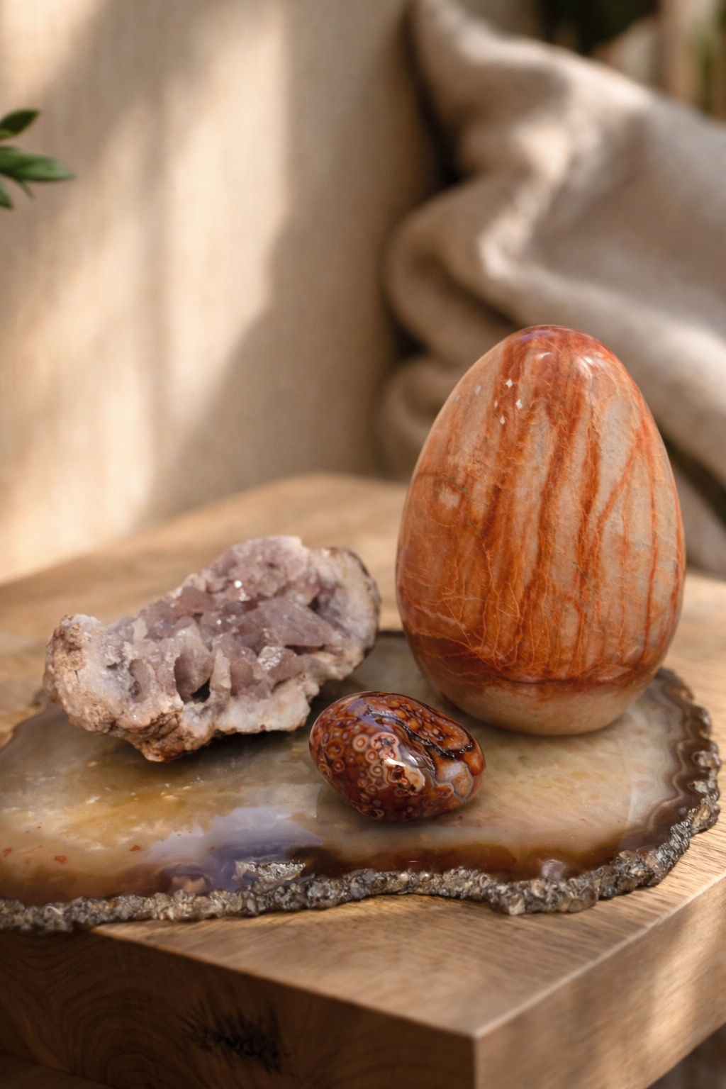 Karneolinis agatas – tai gyvybinės energijos, drąsos ir kūrybinio impulso akmuo, jungiantis karneolio ugninę šilumą ir agato stabilizuojančią struktūrą. Jo šilti, oranžiniai–raudoni atspalviai primena saulės įkaitintą žemę – gyvą, maitinančią ir palaikančią. Tai akmuo, kuris ne stumia, o ramiai pažadina vidinę jėgą.