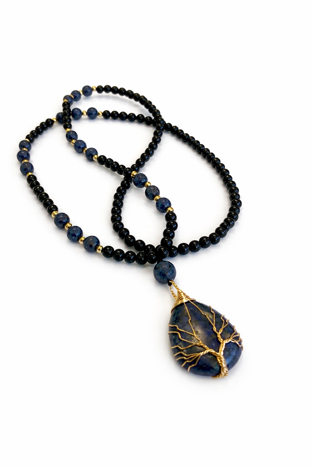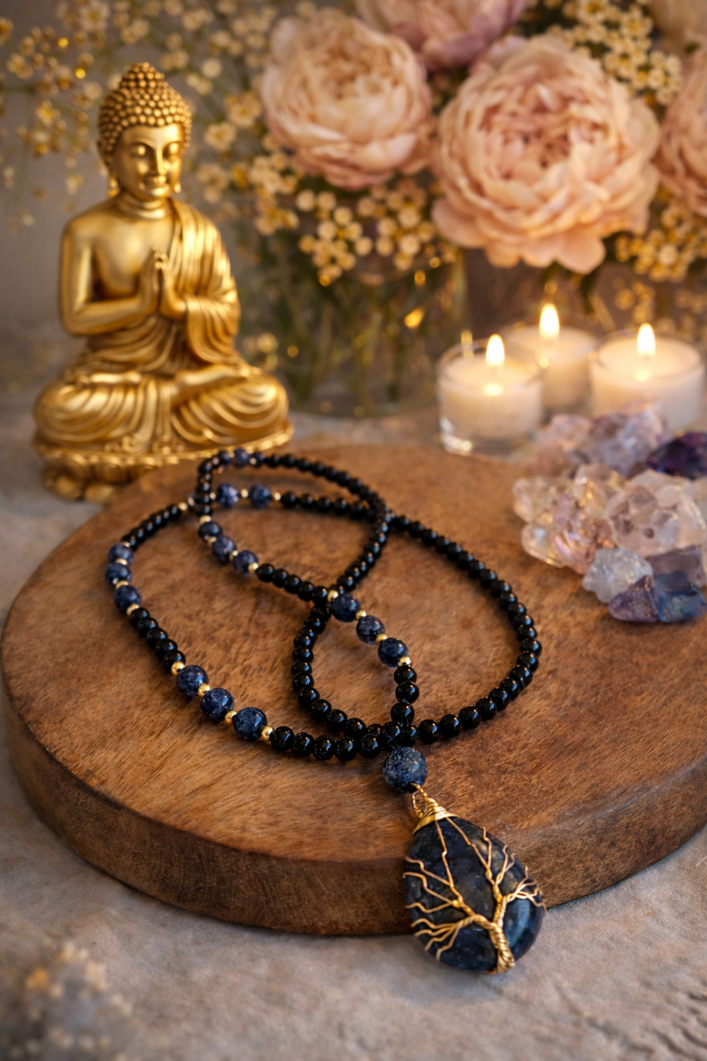Meditacijos karoliai (mala) su sodalitu ir juodu turmalinu – tai aiškaus proto, vidinės tiesos ir stiprios energetinės apsaugos sąjunga. Ši mala skirta tiems, kurie nori ne tik medituoti, bet ir gyventi sąmoningai – kalbėti aiškiai, mąstyti blaiviai ir išlaikyti stabilų vidinį centrą net sudėtingose situacijose.