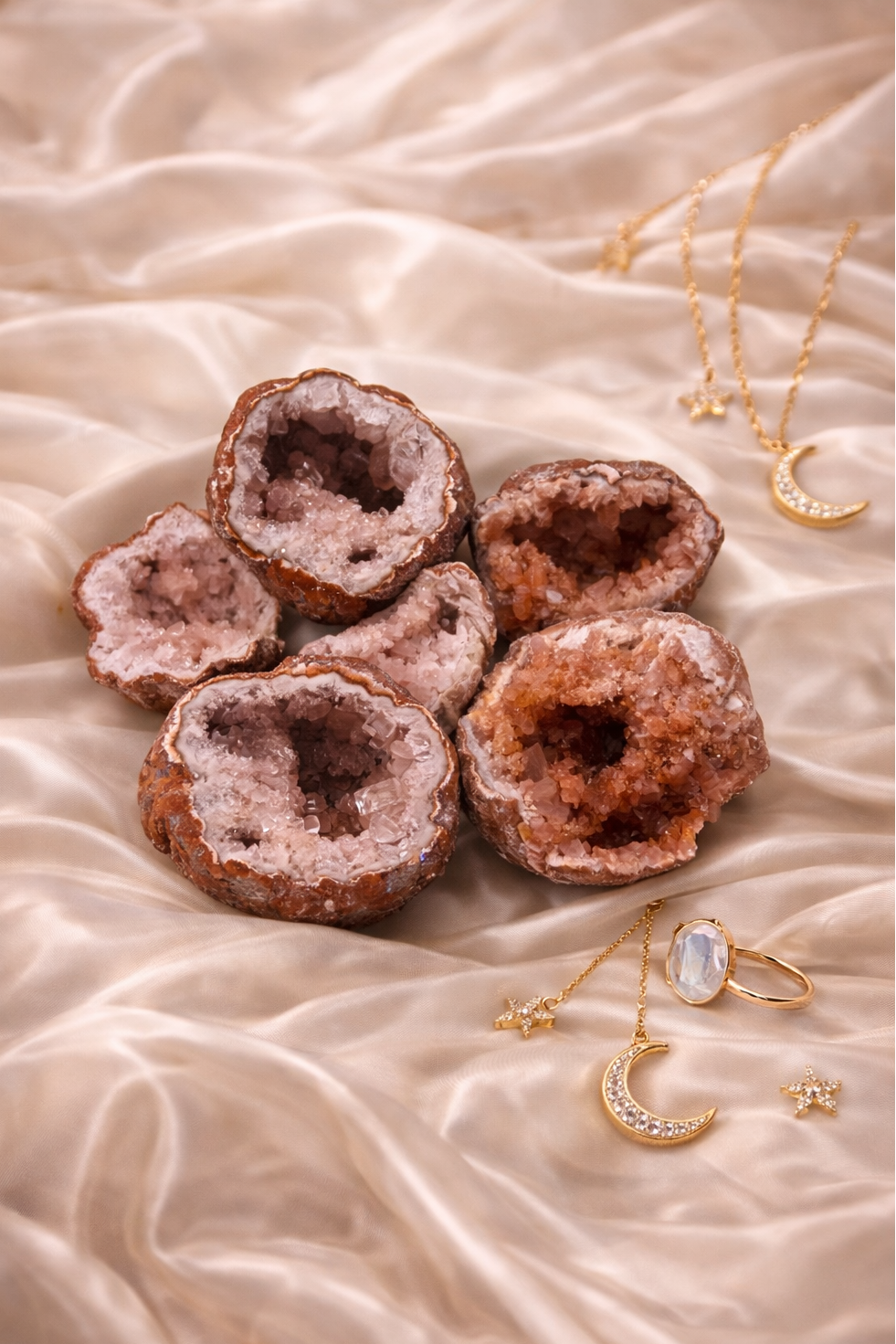 Rožinis ametistas – tai širdies tylos, emocinio saugumo ir vidinės šviesos akmuo, jungiantis ametisto dvasinį gylį su švelnia, moteriška energija. Jo rausvai violetiniai, kartais beveik pieno atspalviai primena aušrą tarp nakties ir dienos – momentą, kai viskas dar tylu, bet jau kupina pažado.