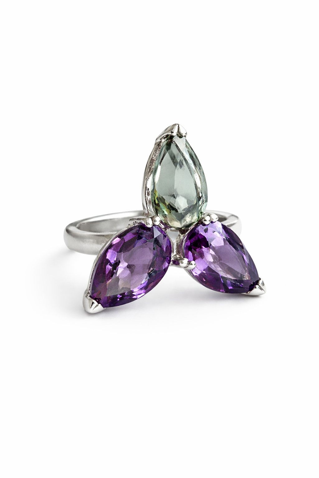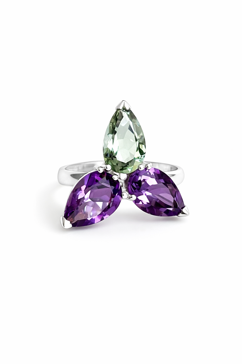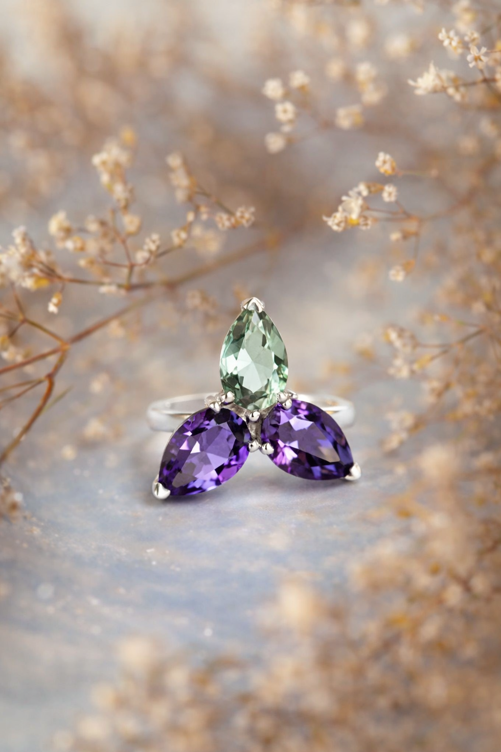 Sidabrinis ametisto ir žaliojo topazo žiedas – tai subtilios dvasinės ramybės ir širdies harmonijos derinys. Violetinis ametistas ir gaivus žalias topazas šiame papuošale susijungia tarsi dangus ir žemė – vienas akmuo ramina protą ir stiprina intuiciją, o kitas atveria širdį gyvenimo džiaugsmui, augimui ir vidinei pusiausvyrai.