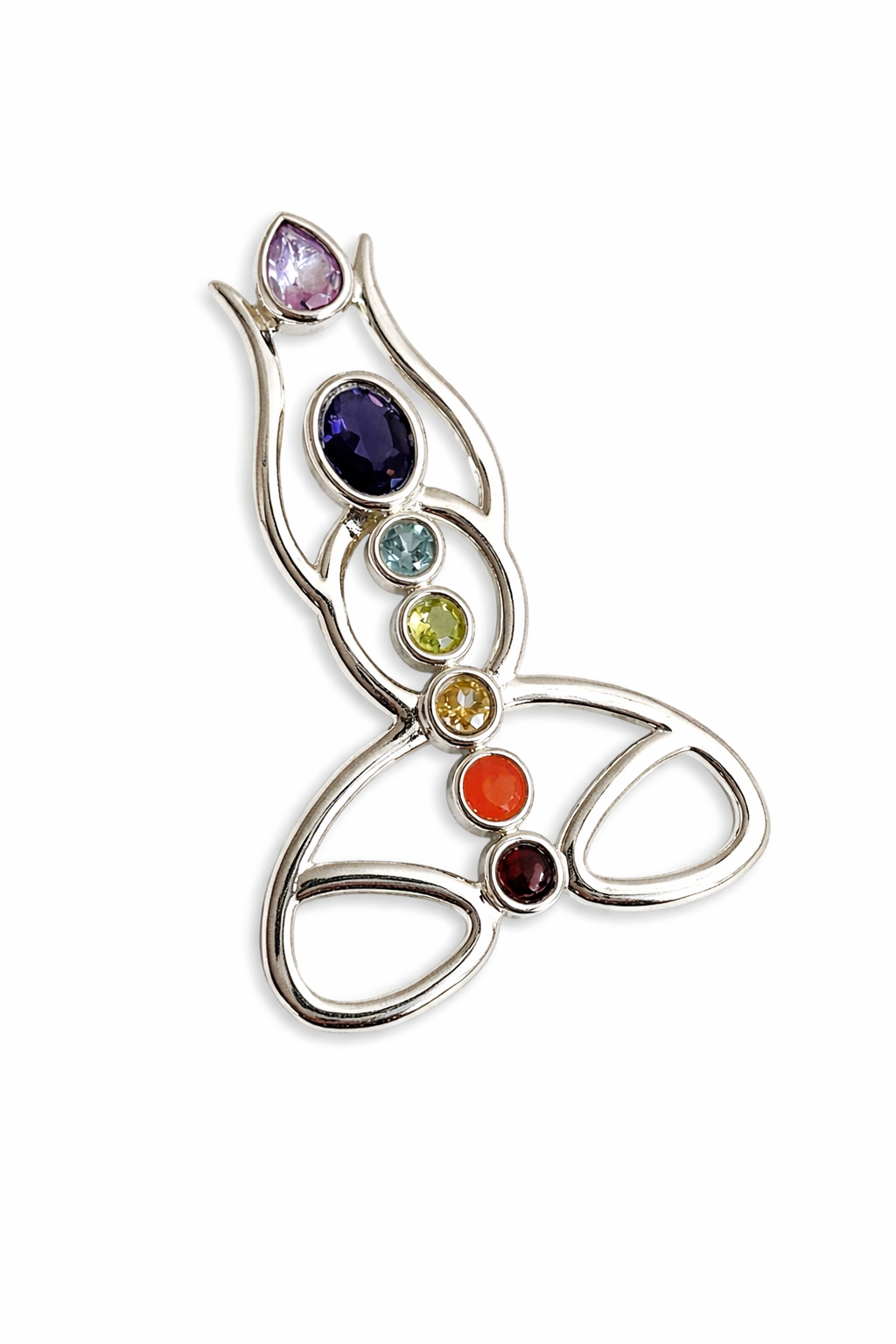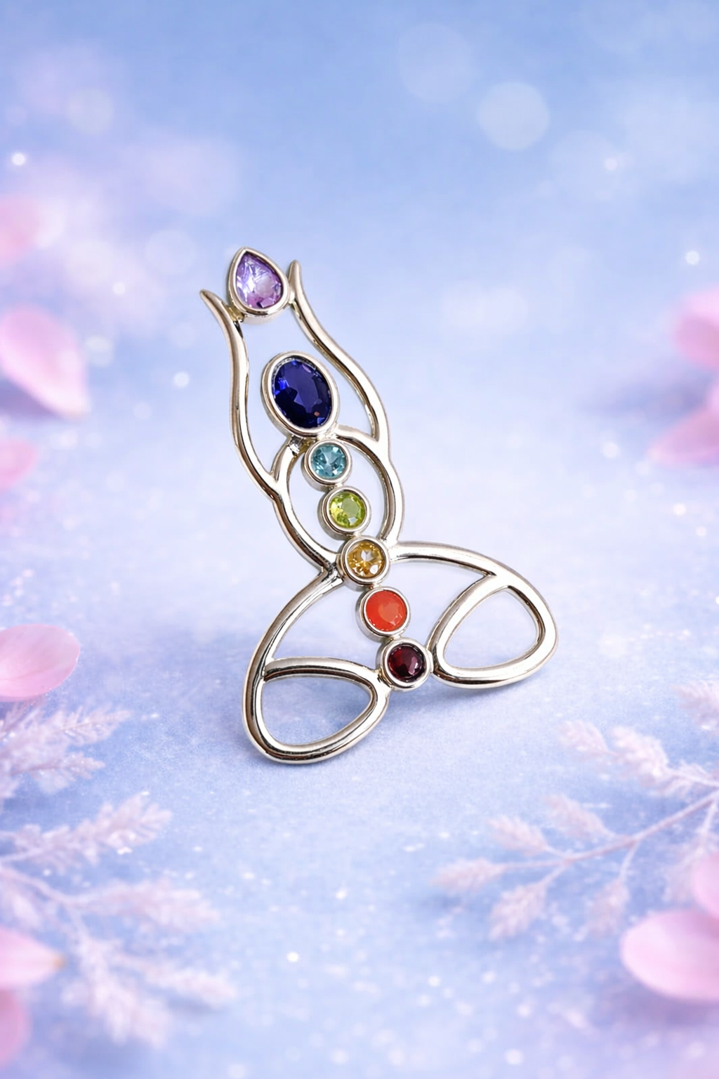 Sidabrinis pakabukas su kristalais (granatas, raudonas koralas, dūminis kvarcas, citrininis topazas, žydras topazas, mėlynas topazas, ametistas) – meditacijos forma – tai sąmoningumo, vidinės harmonijos ir subtilios energijos simbolis. Pakabuko forma primena meditacinę būseną – centrą, kuriame susitinka ramybė, aiškumas ir gyvybinė energija. Skirtingų spalvų kristalai tarsi mažos energijos žvaigždės susijungia į vieną visumą, simbolizuodami subalansuotą žmogaus vidinį pasaulį.